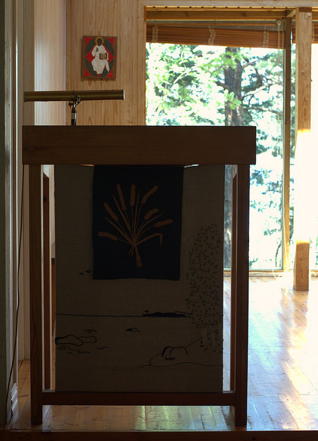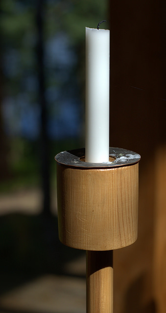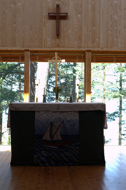 För ett tag sedan skrev vi ett inlägg om ikonen längst bak i kapellet. Då vet ni att den är en gåva vi fått en gång för länge sedan. Visste ni att samma gäller för det mesta i kapellet – bland annat kyrkotextilierna och dopfunten – och att kapellet självt är byggt av frivilliga? Nu vet ni det!