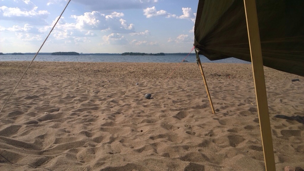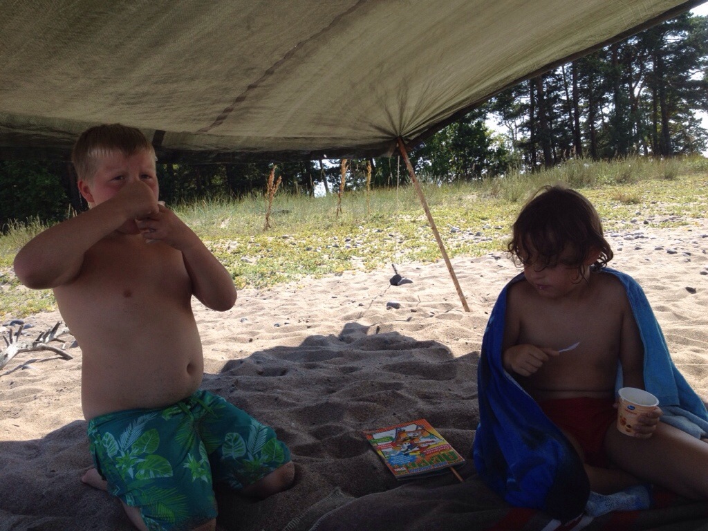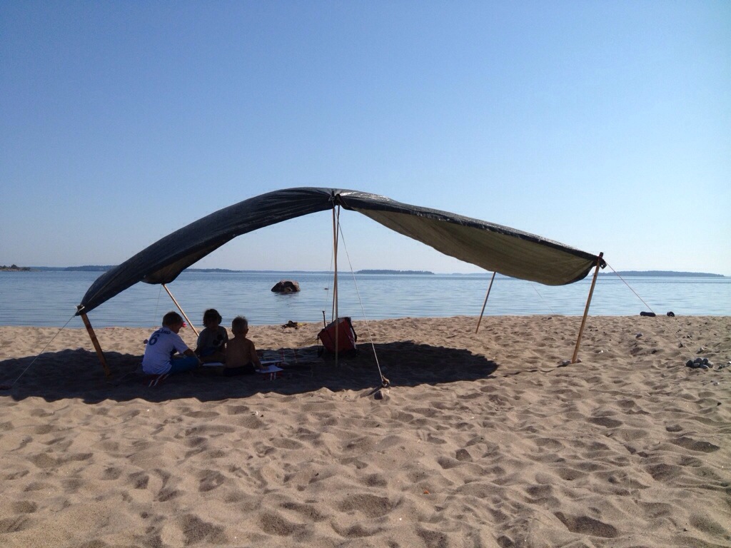 Nej. Det är inte en bild av beduiner i Sahara. Det är våra holmboende barnfamiljer som byggt ett skydd mot den gassande solen för att kunna hänga hela dagarna på Helsingfors hetaste beach: Kapelludden.