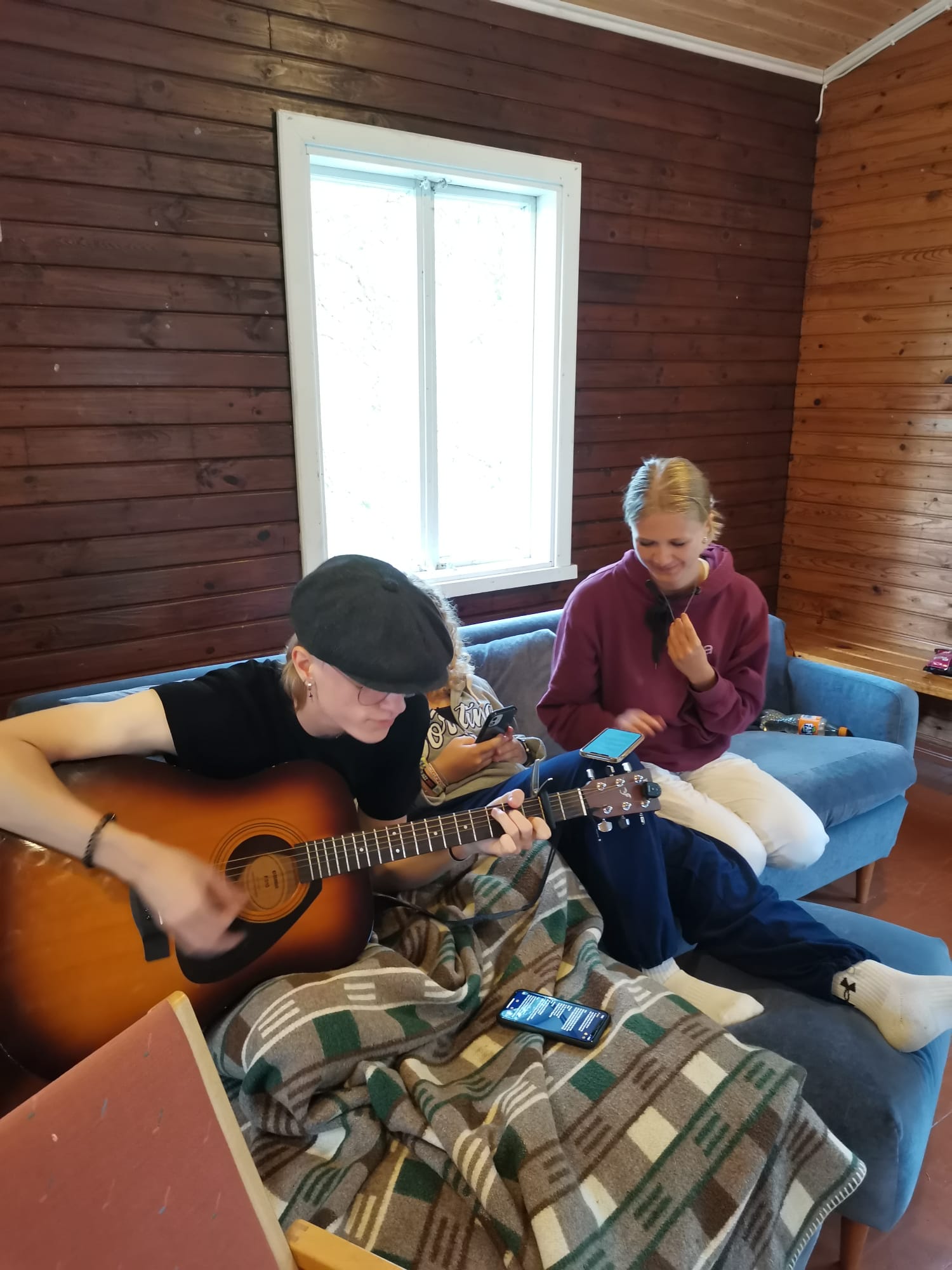 Man kan också komma på kreativa saker att göra, den här veckan har våra holmhjälpisar skrivit en egen låt. Här är en bild då de sitter i solstugan och övar på sin sång som just blivit färdig. Det finns även målfärg och pennor, så man kan rita och måla då det inte går att vara ute. Det är också roligt att göra vänskapsarmband eller pyssla.