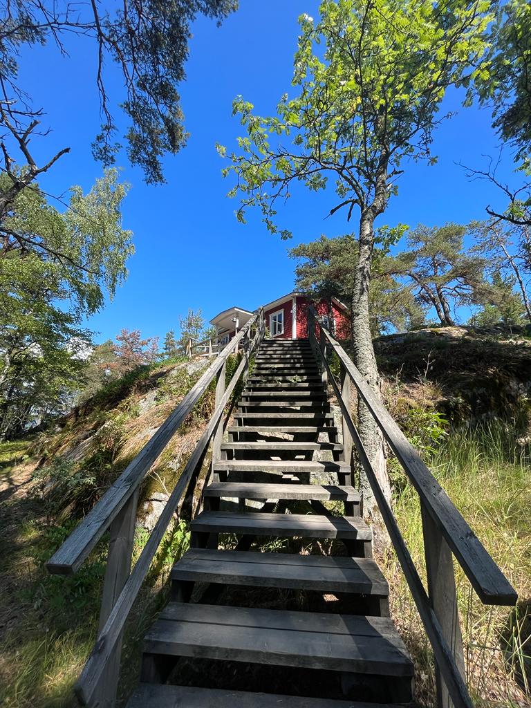 Just nu står vi på bryggan, och precis framför oss ser du det röda huset som kallas Prästis. Som namnet antyder bor skribalägrenas vuxna ledare och prästen där.
