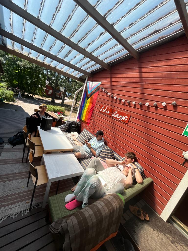 Om vi fortsätter längs stigen förbi Prästis, kommer vi till Kostis, det enda gröna huset på holmen. Här äter vi alla våra måltider. Det röda lilla huset intill Kostis kallas Tuffis, och det är där jag och de andra ungdomsledarna bor. Lekis Loungen ligger precis bredvid Tuffis, och där hittar du oftast våra hjälpisar. Trapporna upp från Loungen och Tuffis leder till Solstugan, som är det perfekta stället om du vill spela något eller bara njuta av en trevlig tid. Jag vågar påstå att Solstugan har den bästa utsikten på holmen. Härifrån ser du Nordsjös hamn och hela holmen. De närmaste stugorna heter Herrgården, Buren och Hyddan, men de används oftast av lägergrupper, så vi behöver inte gå in där.