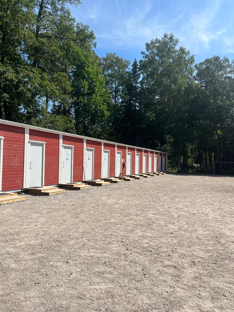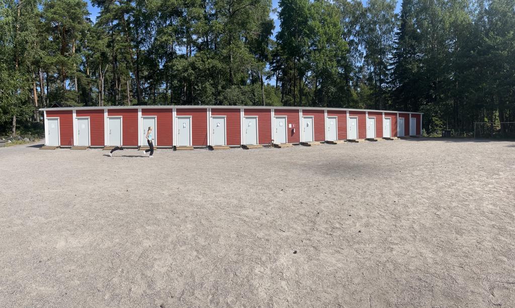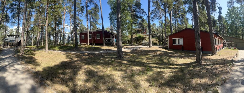 Det kubformade huset framför oss är toaletten som kallas Geppis. Till vänster om Geppis finns en inte så stor röd byggnad som ändå kallas Storstugan, det är ett av våra undervisningsutrymmen. Om vi fortsätter längs stigen förbi Geppis, kommer vi till Tokas och Harpis. För tillfället är Tokas stängt, men Harpis används av lägergrupper. Fortsätter du längs stigen åt höger kommer du till Standstugan, som också är ett undervisningsutrymme. Allra längst fram på holmen finns Lejongapet, där inne finns några sovrum, och det är den sista byggnaden på holmen.